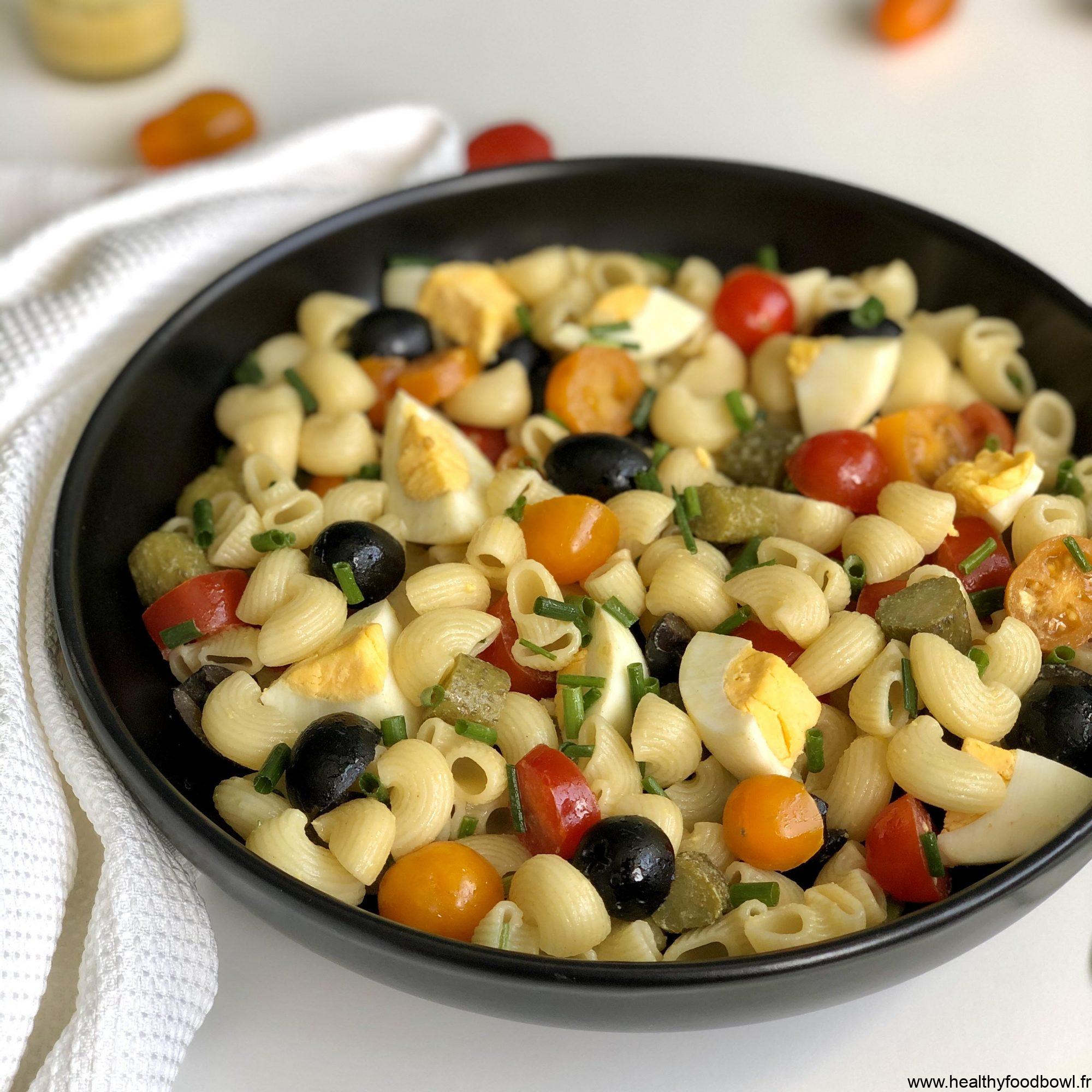 Salade de pâtes Infos pratiques 2 personnes Niveau : moyen Matériel Casserole, planche à découper, couteau Saladier Ingrédients 100 g de pâtes 100 g de tomate cerise (jaune et rouge) 50 g de cornichon 80 g d’olive noir dénoyauté 3 œufs durs 10 tiges de ciboulette Vinaigrette (10 g de moutarde ; 10 ml d’eau …