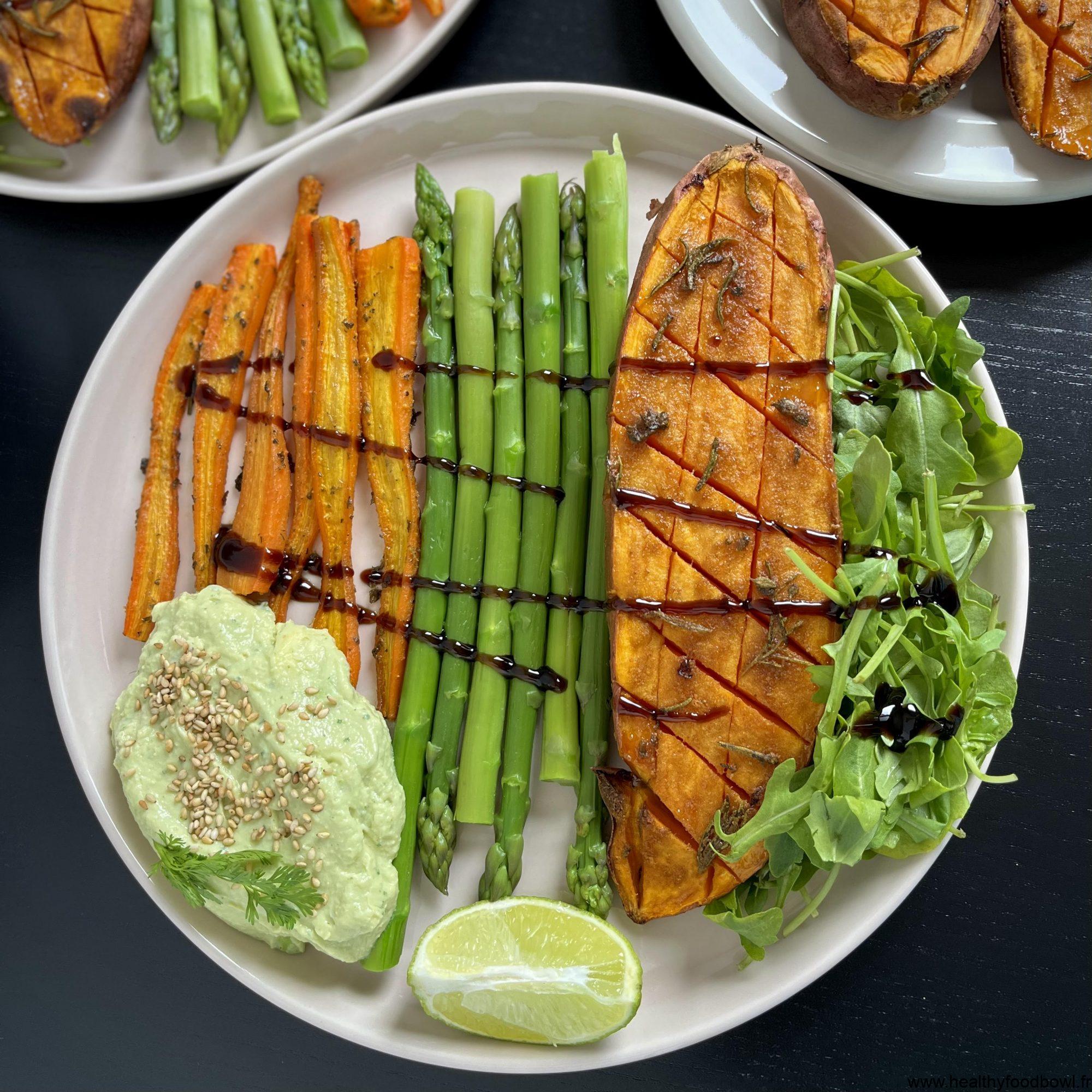 Patate douce rôtie, asperge, carotte, roquette et purée d’avocat Houmous