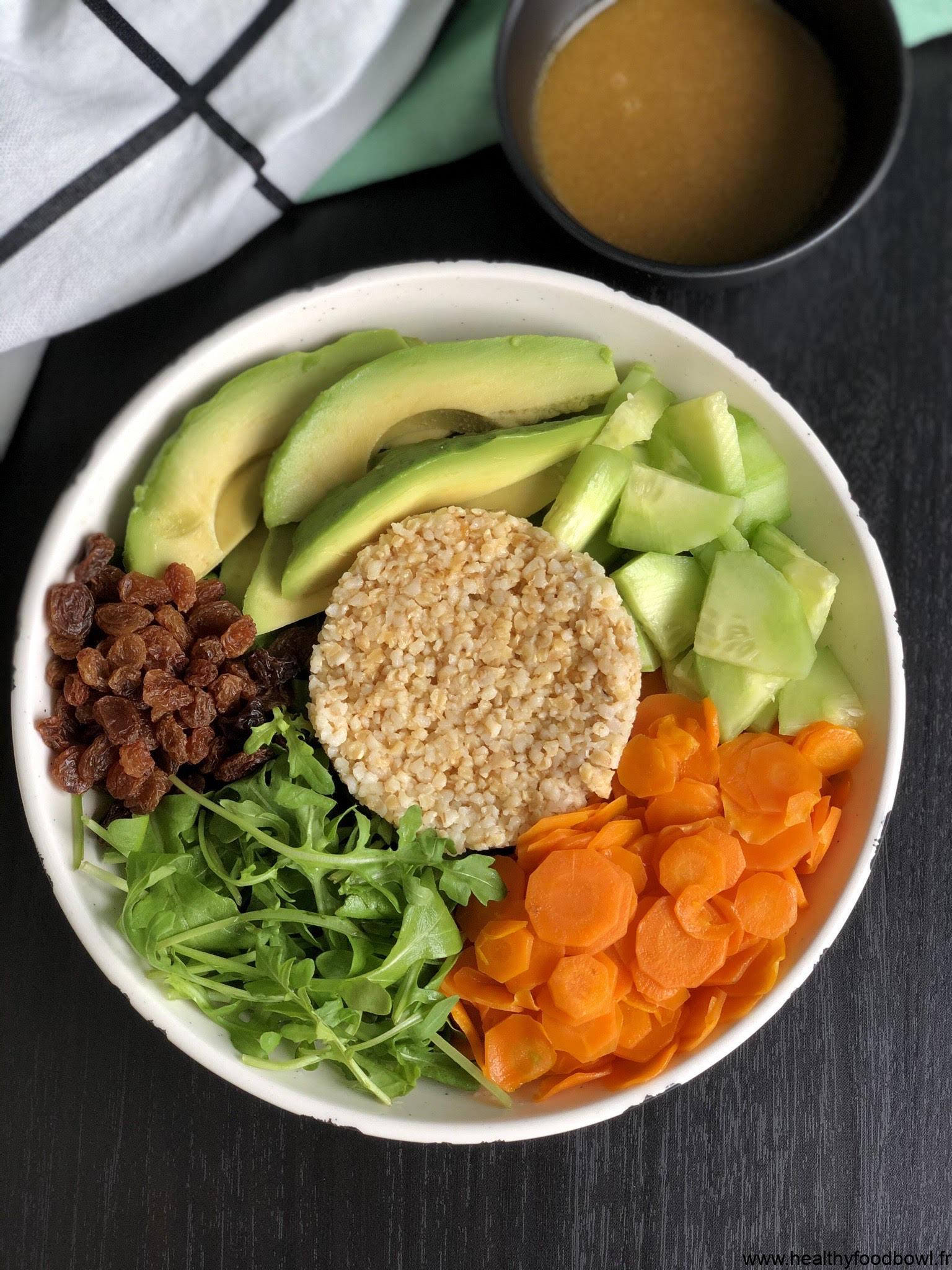 – Dans deux bols, mettez au centre le boulgour en vous servant d’un cercle si vous en avez. Alignez autour du boulgour les carottes poêlées, les morceaux de concombre et d’avocat, la roquette et les raisins secs.