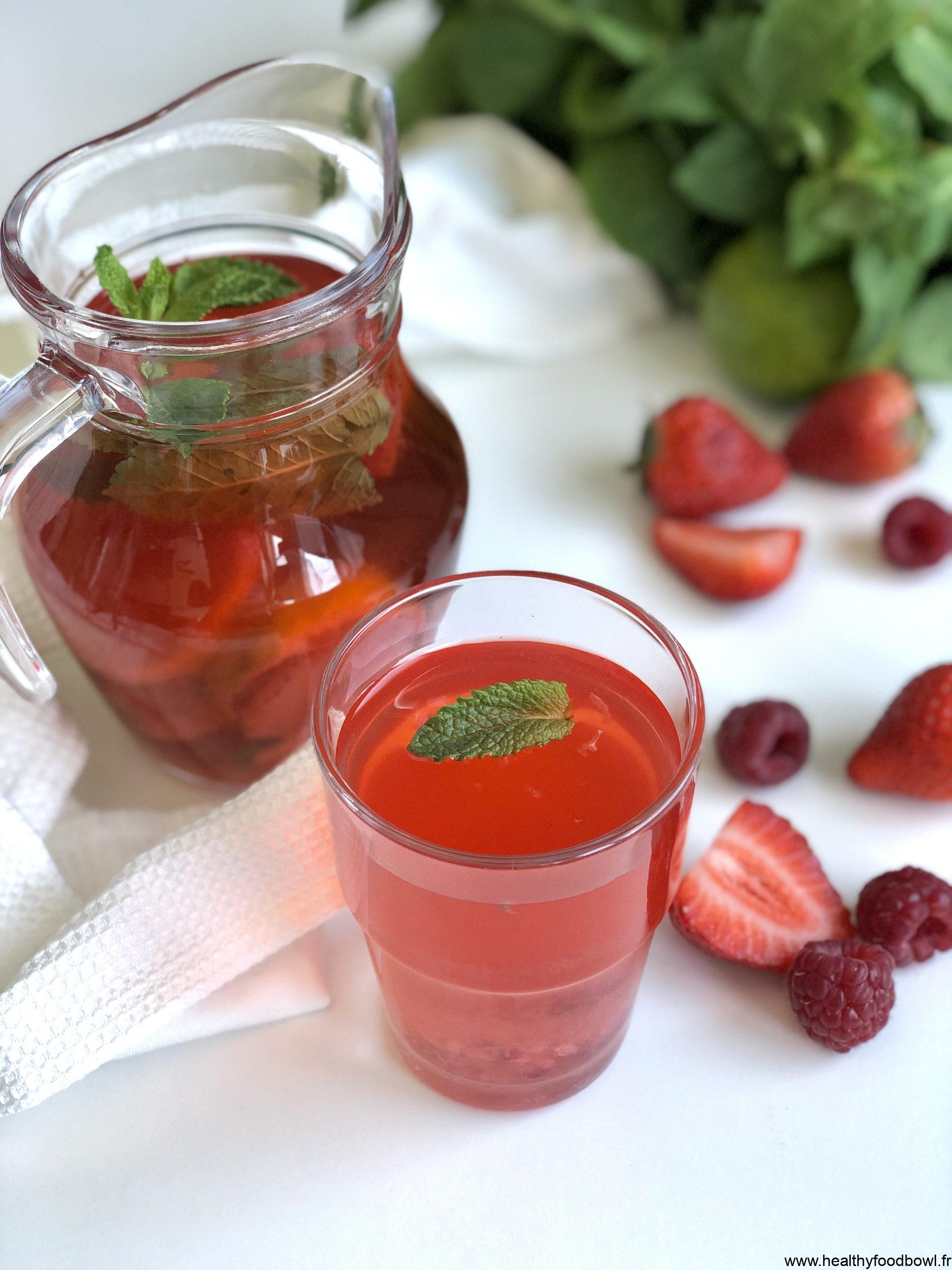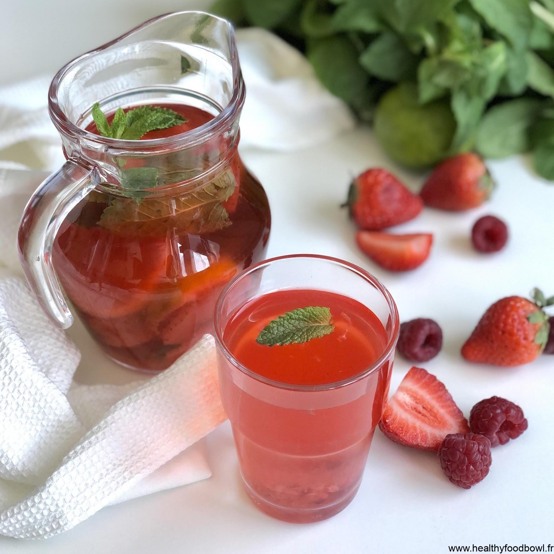 – Versez l’eau dans une bouteille ou une carafe. Mettez-y : le jus de citron, les feuilles de menthe, les morceaux de fraises, les framboises écrasées et les rondelles de citron. Fermez la bouteille ou la carafe et placez-la au réfrigérateur pendant 4h. Secouez ou remuez avant de servir.