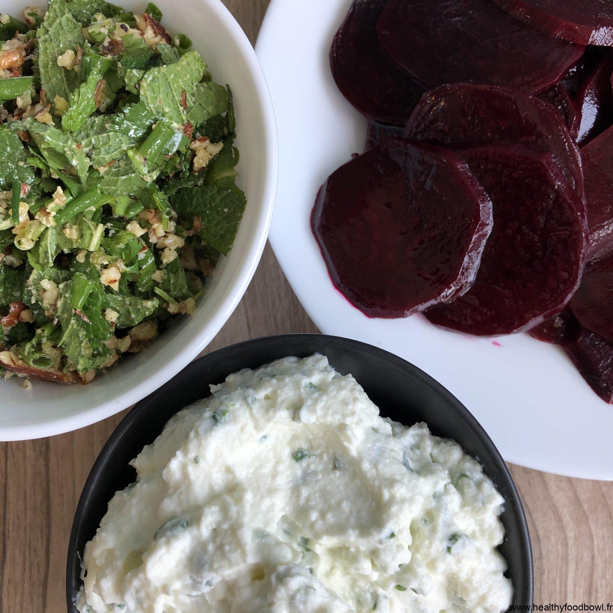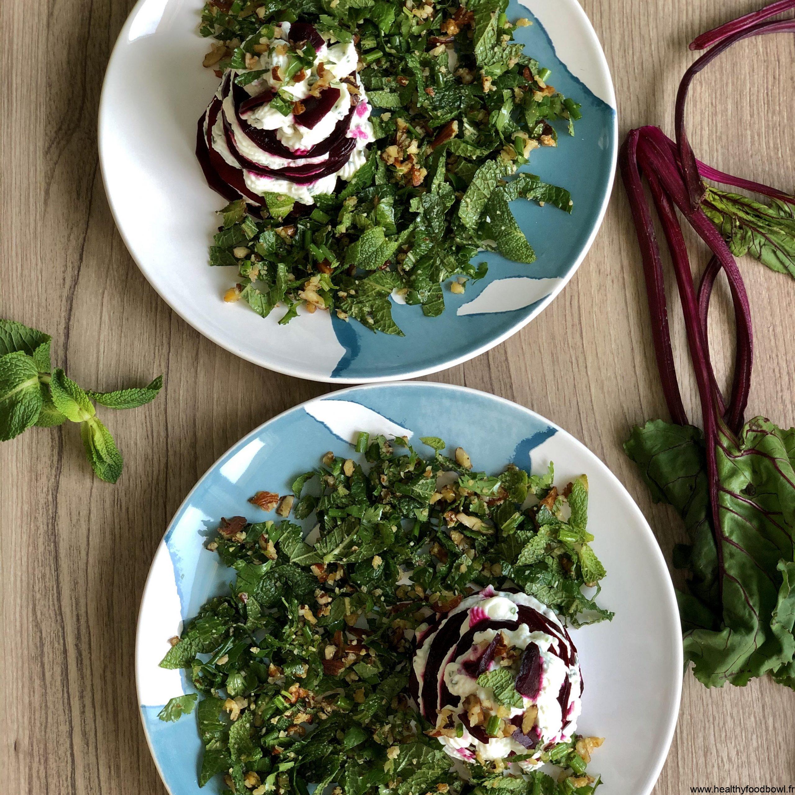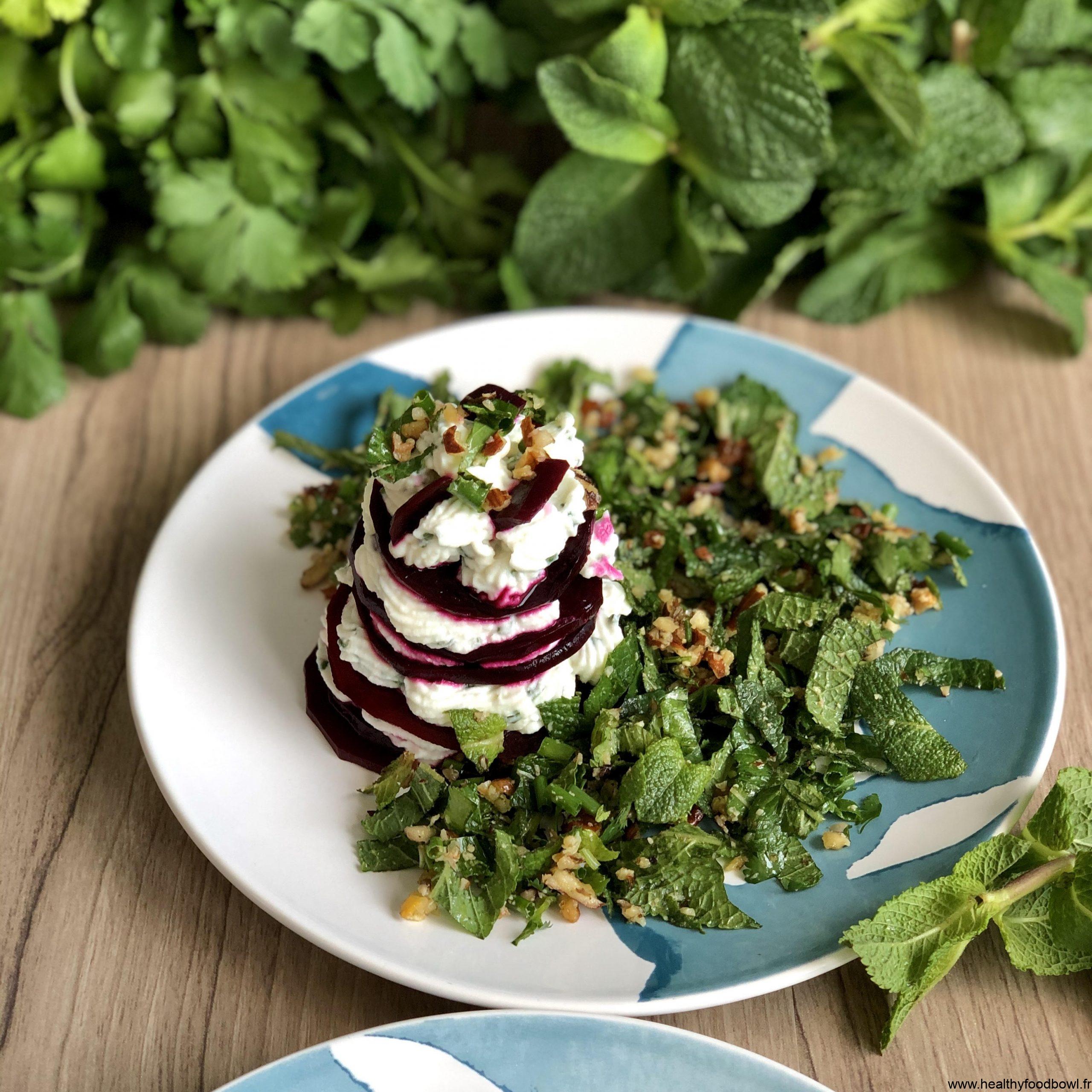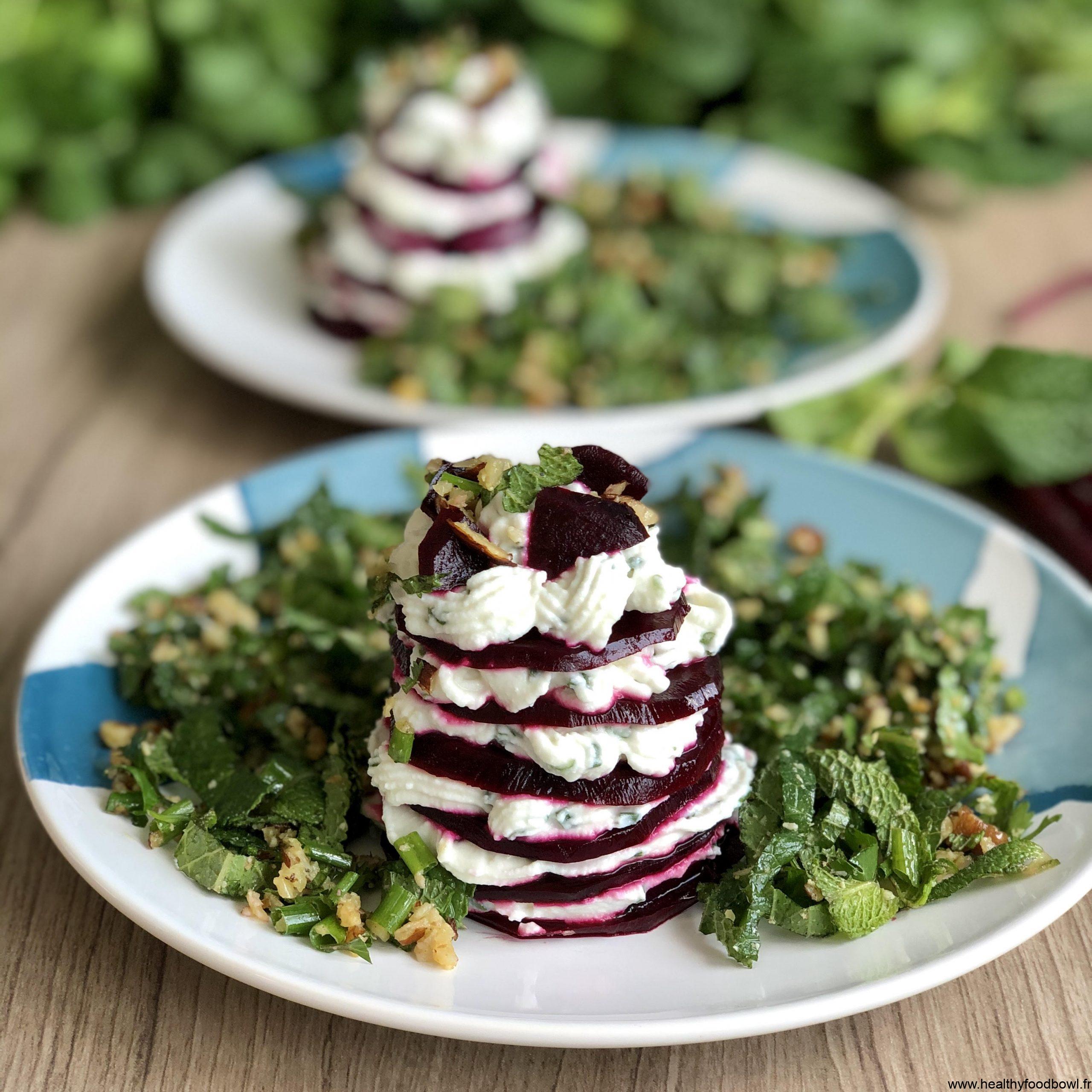 – Montage du millefeuille de betterave : Remplissez une poche à douille du mélange de ricotta et de fromage. Dans une assiette, déposez une rondelle de betterave, ajoutez ensuite le mélange de ricotta et de fromage de brebis ; déposez à nouveau une rondelle de betterave et répétez l’action jusqu’à faire 5 à 6 étages. Refaites la même action pour réaliser les deux autres millefeuilles de betterave. Ajoutez ensuite quelques cuillères de salade d’herbes aromatiques autour des millefeuilles de betterave rouge. Réservez au réfrigérateur 15 à 20 min et bonne dégustation à vous !
