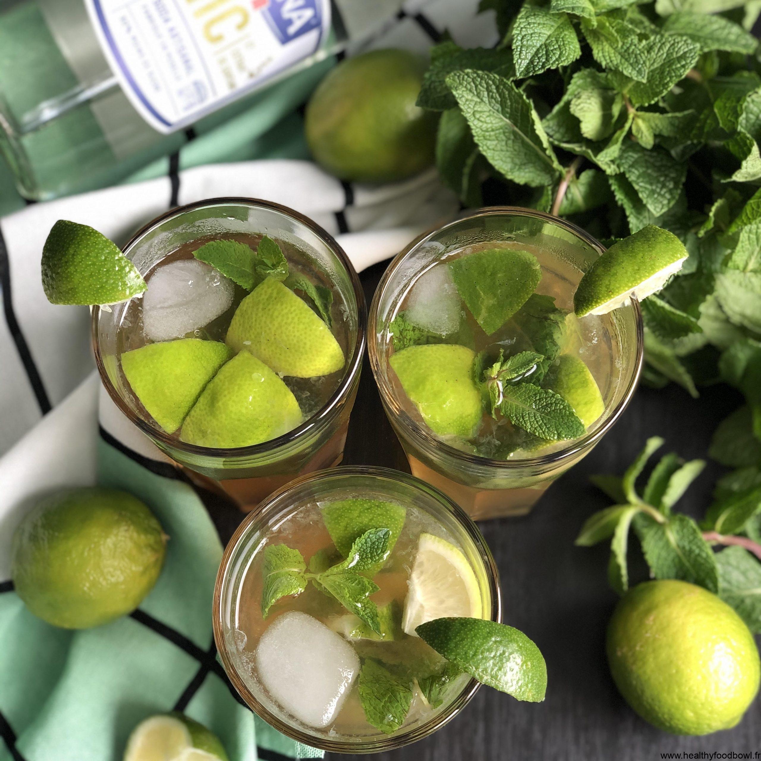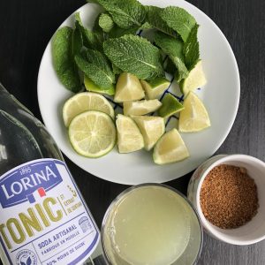 – Dans chaque verre mettez : 5 g de sucre de fleur de coco ; 10 ml de jus de citron ; 5 feuilles de menthe que vous froissez dans la paume de vos mains ; 3 morceaux de citron ; glaçons et 30 cl du mélange eau tonic.