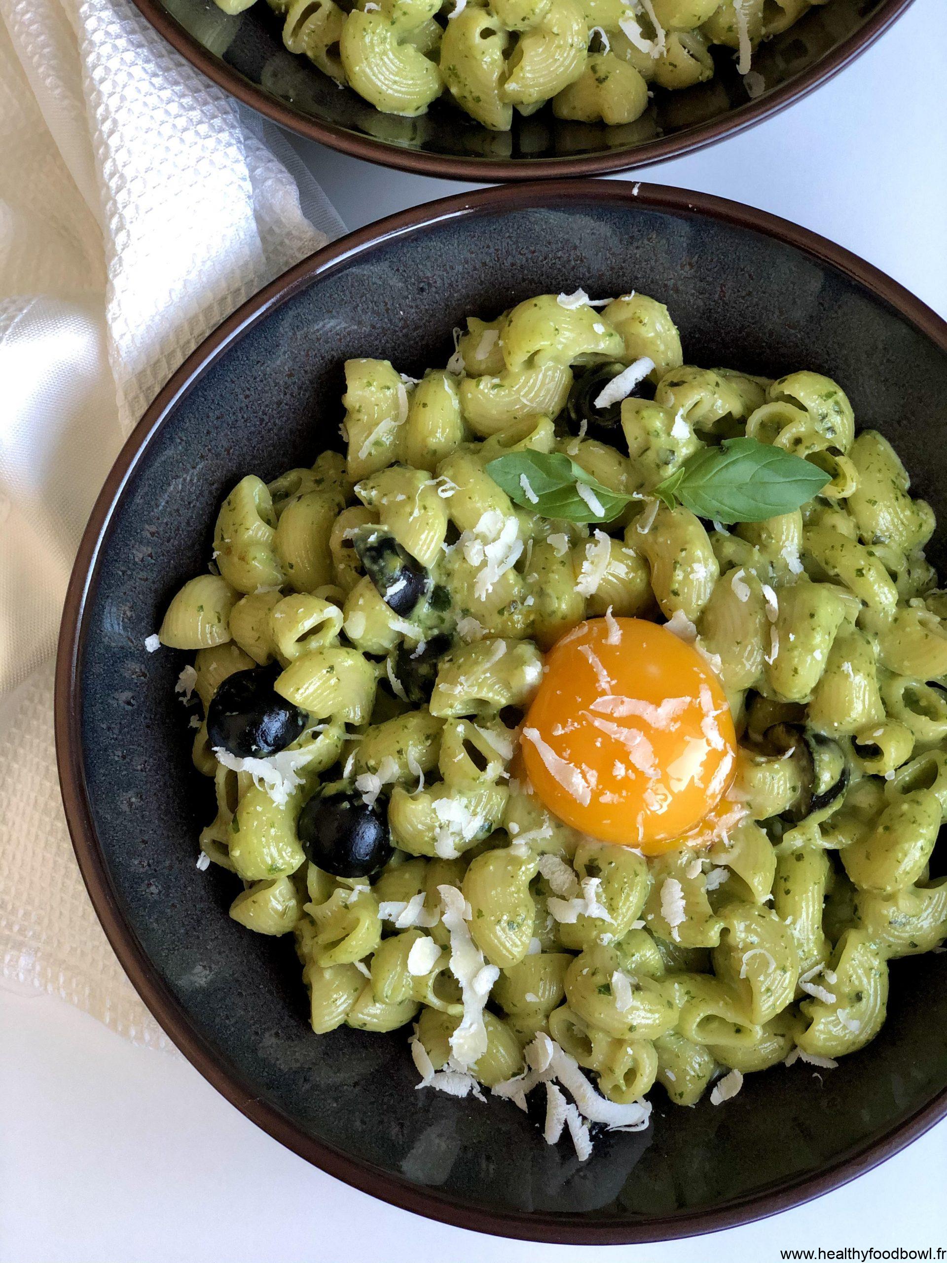 Réalisation des pâtes au pesto et à la crème : Mettez la crème liquide dans une casserole et portez-la à ébullition. Retirez la casserole du feu et mettez le pesto dans la crème. Mélangez correctement pour obtenir une sauce lisse. Versez les pâtes dans la sauce et mélangez. Découpez chaque olive en deux et ajoutez-les aux pâtes. Servez vos pâtes crémeuses au pesto dans deux assiettes. Prélevez le jaune d’œuf de chaque œuf et posez-le délicatement au centre des pâtes. Râpez un peu de parmesan par-dessus et bon appétit.