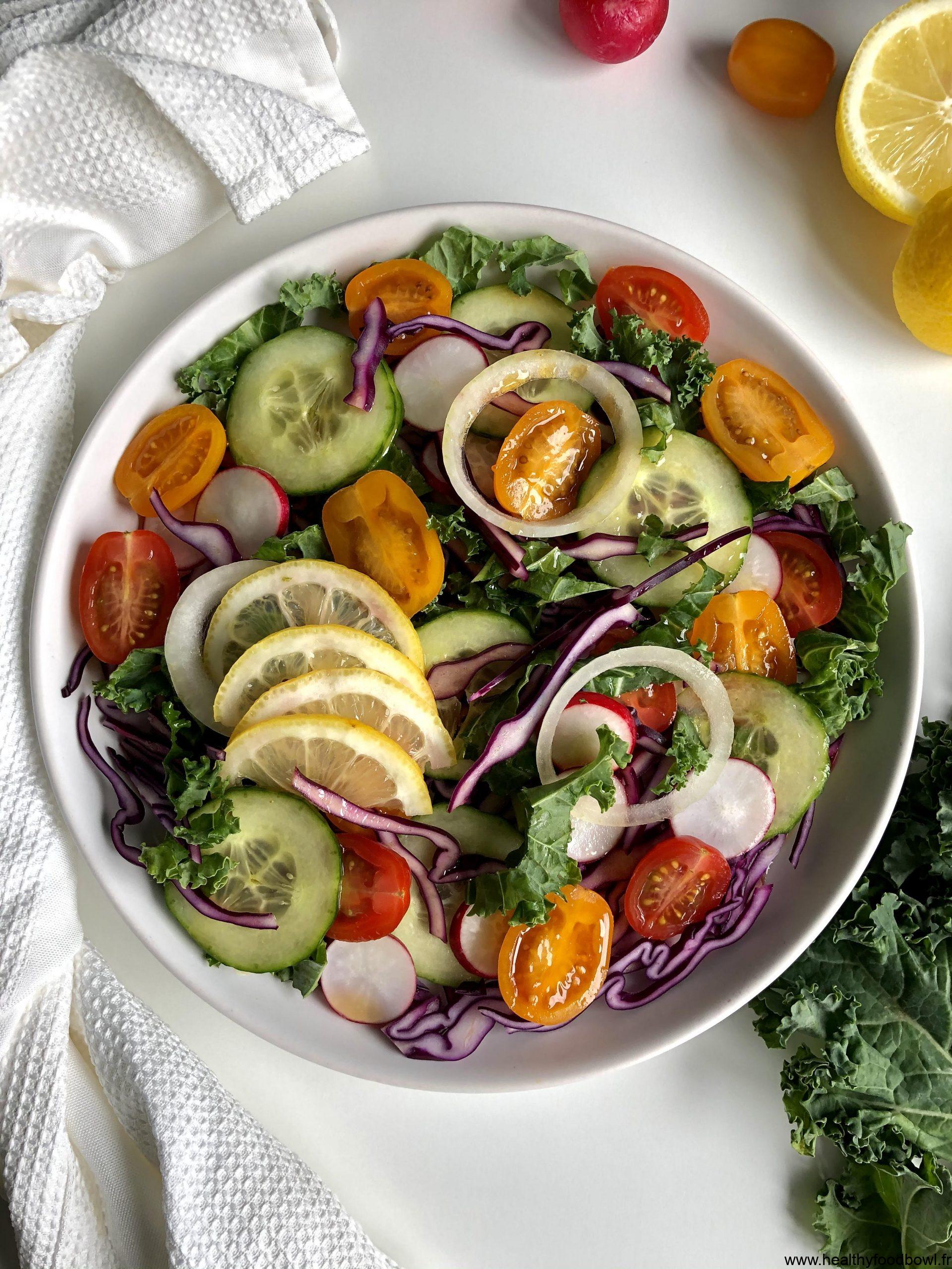 Montage de la salade : Dans un plat, posez le chou kale, ensuite le chou rouge, les tomates, les concombres et les radis. Déposez les demi-rondelles de citron et d’oignon sur la salade. Ajoutez quelques cuillères de vinaigrette et voilà c’est prêt !