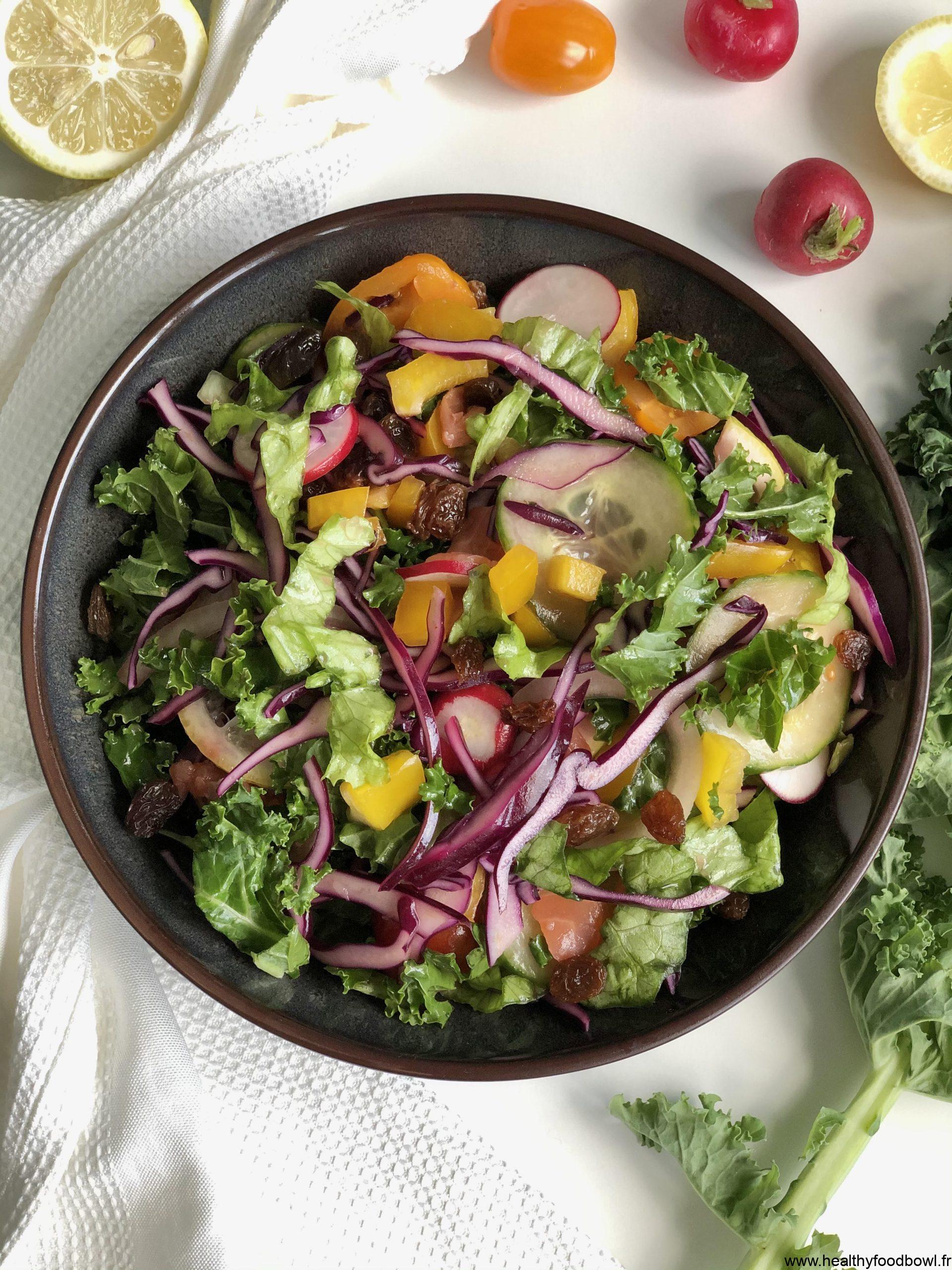 Réalisation de la salade : Dans un grand saladier, mettez : chou kale, chou rouge, laitue, tomate, oignon, poivron, raisin sec, radis et concombre. Ajoutez la vinaigrette et les morceaux de saumon fumé puis mélangez bien le tout. Votre salade est prête, il ne vous reste qu’à la servir dans deux assiettes.
