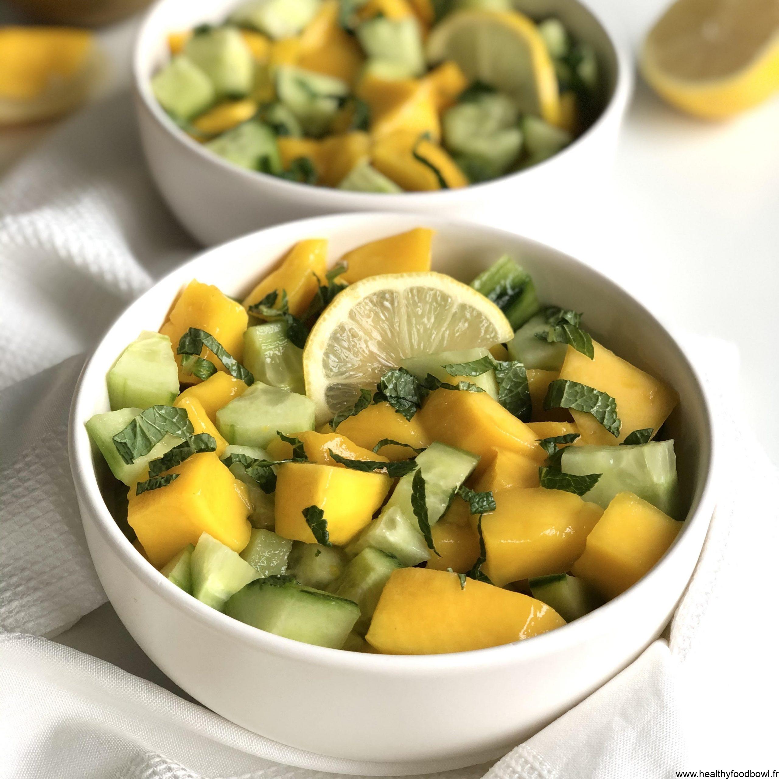 Voici une association au top pour le goûter qui vous permettra de manger à la fois des fruits et des légumes. Le goût sucré de la mangue et celui un peu neutre du concombre se marient bien ensemble. N’hésitez pas à tester cette recette à base de mangue et concombre.