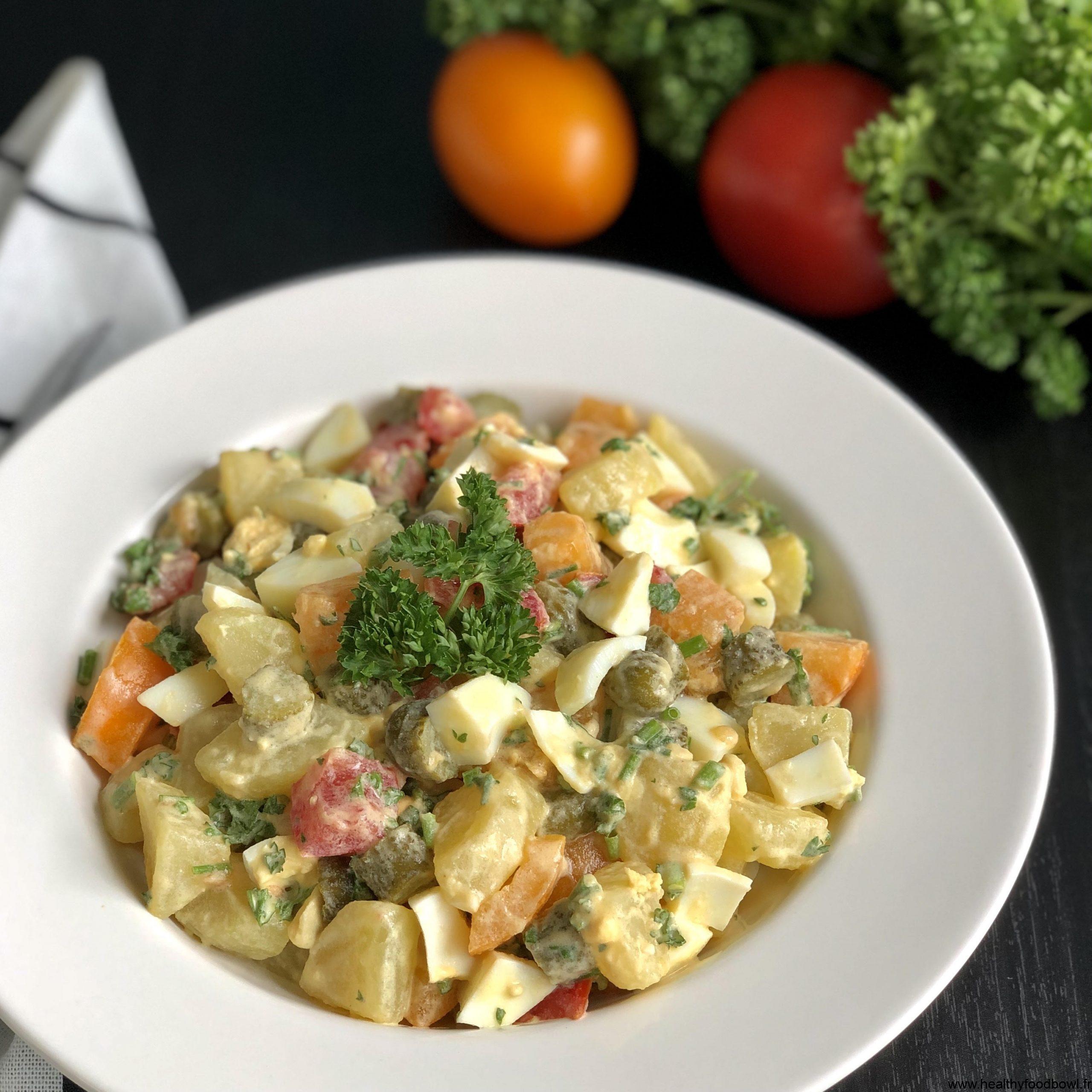 – Pelez, lavez et découpez les pommes de terre en petits carrés. Faites-les cuire ensuite pendant 12 min dans une eau bouillante et légèrement salée. Une fois les pommes de terre cuites, égouttez-les et laissez-les refroidir complètement à température ambiante.