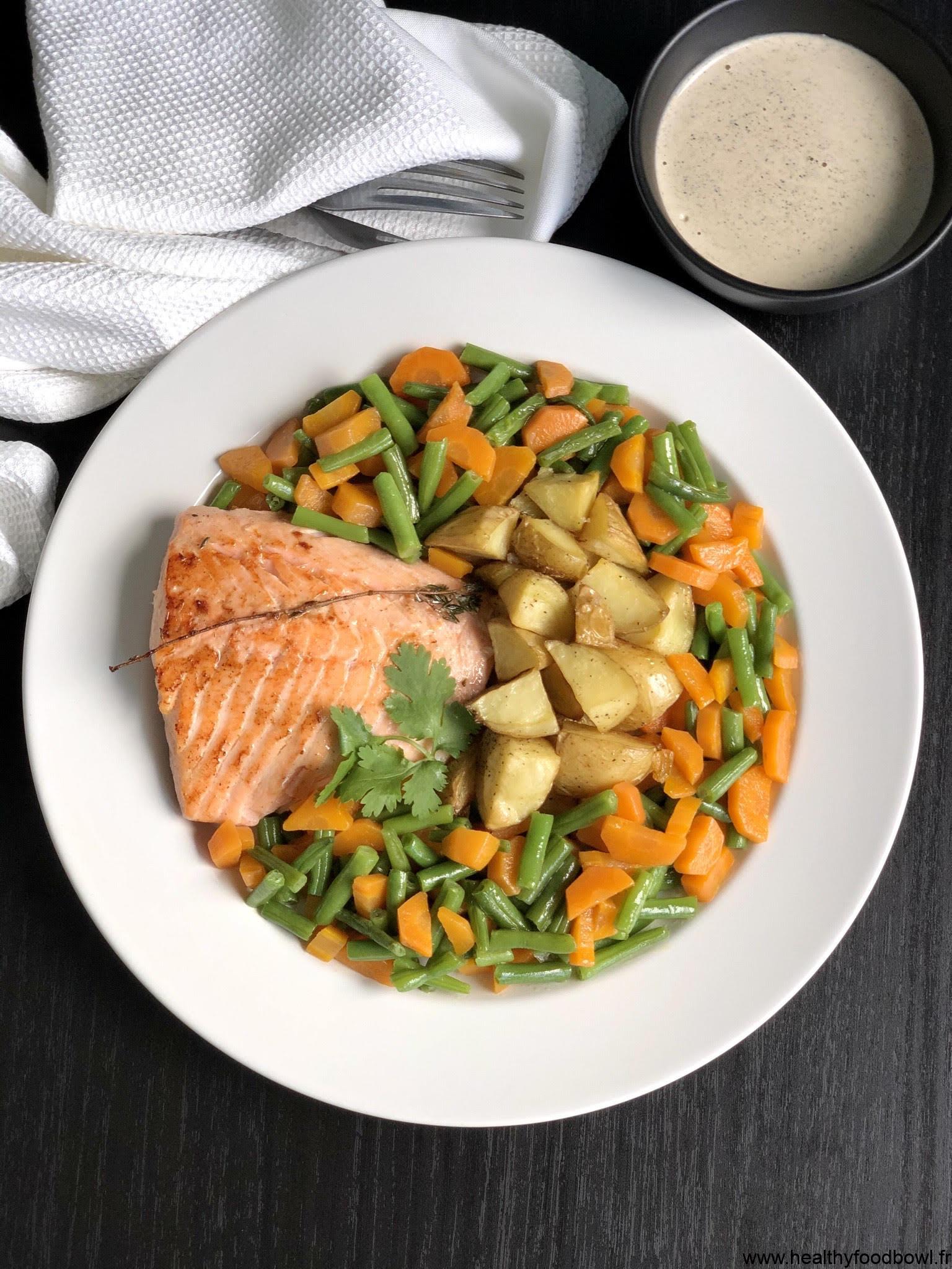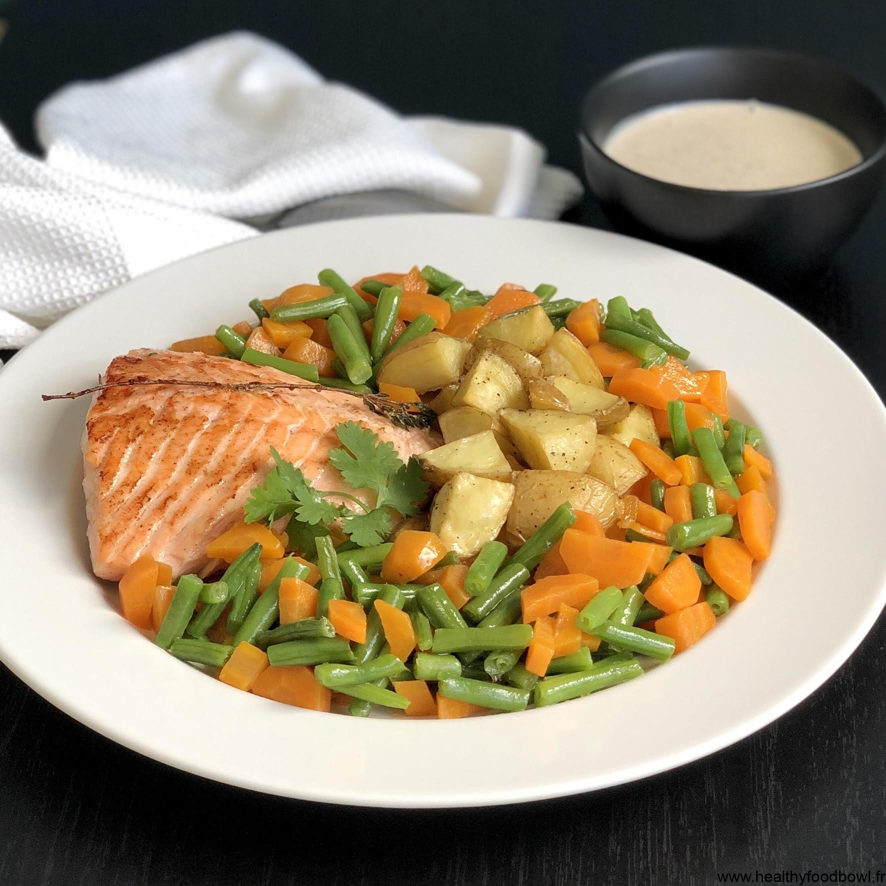 200 g de carotte ; 200 g d’haricot vert ; 300 g de pomme de terre du primeur ; 400 g de saumon frais (2 pavés) ; 20 cl de crème légère fluide ; 4 g de poivre ; 20 ml d’huile d’olive ; 15 g de beurre ; Branche de thym ; Sel.