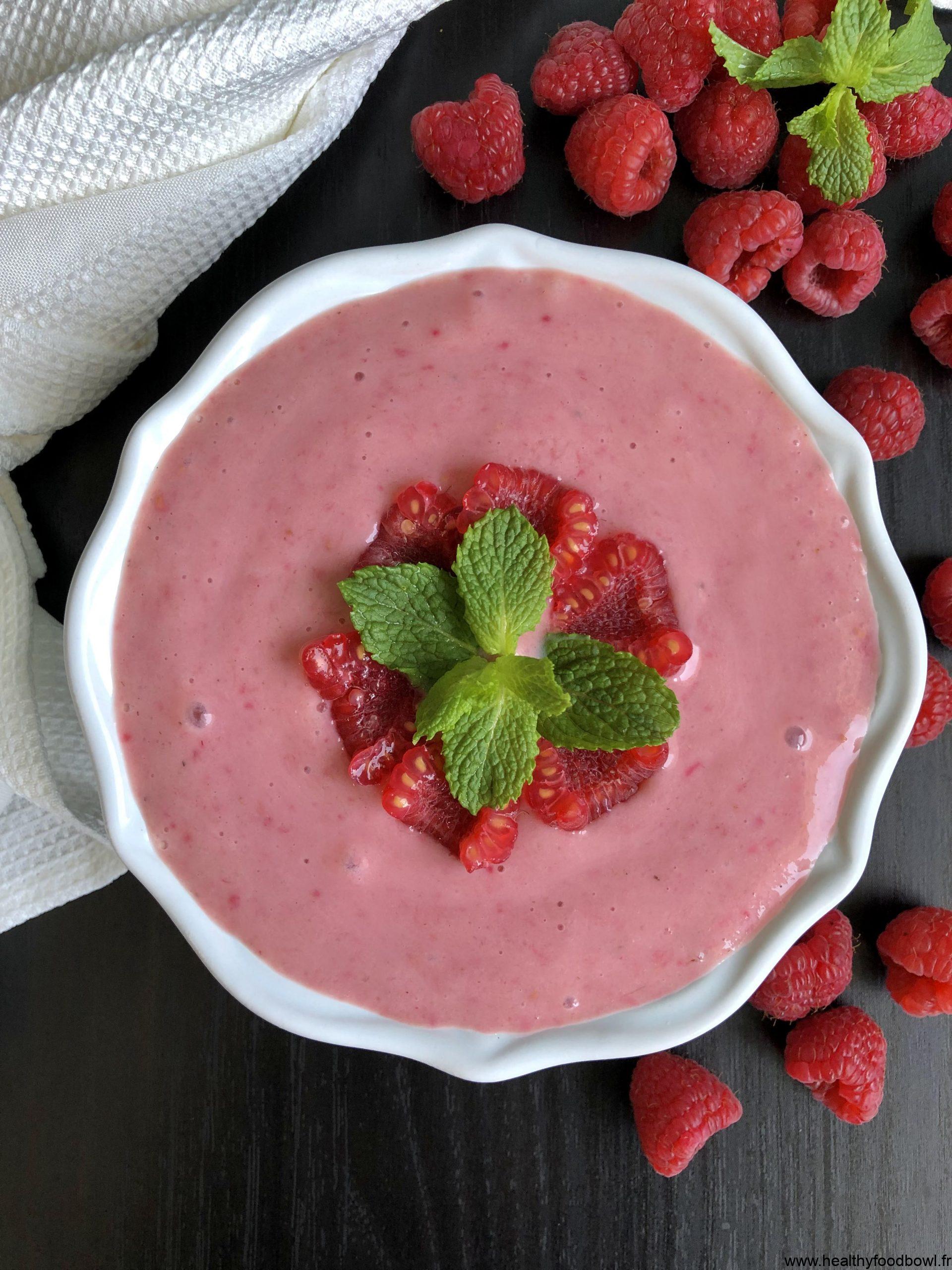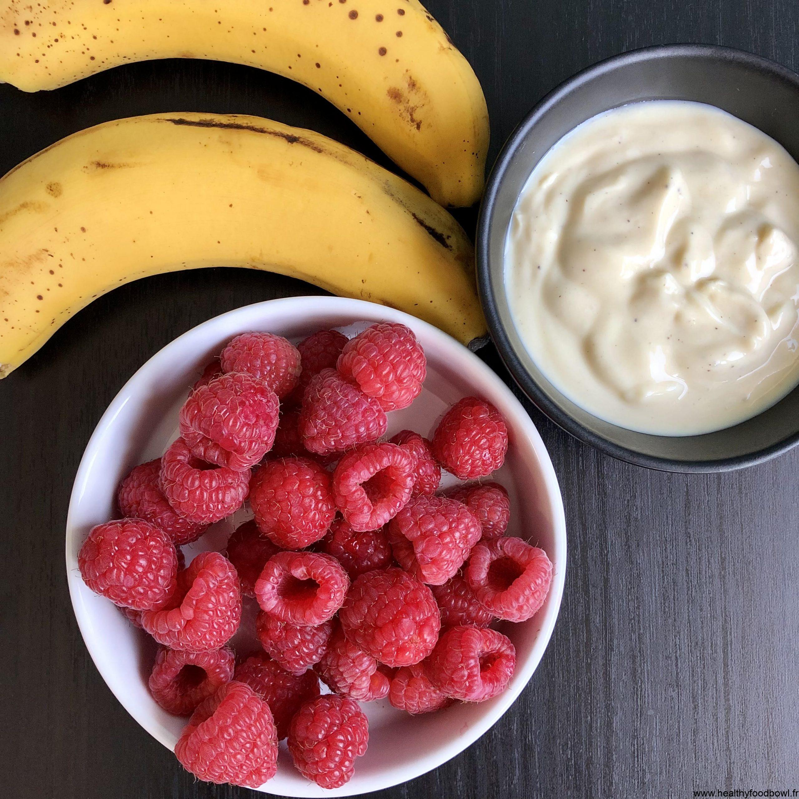 – 200 g de framboise ; 2 bananes ; 150 g de yaourt de soja à la vanille