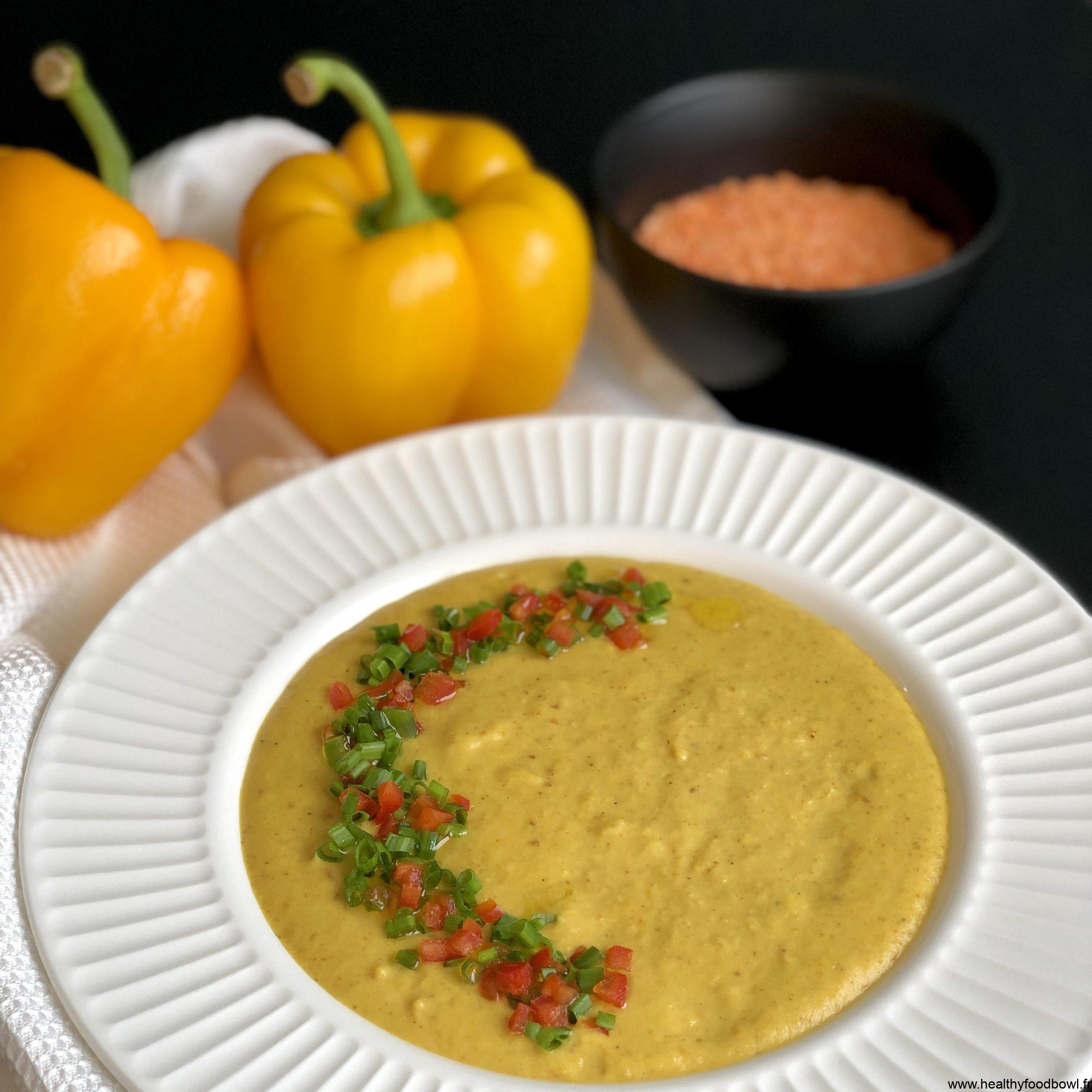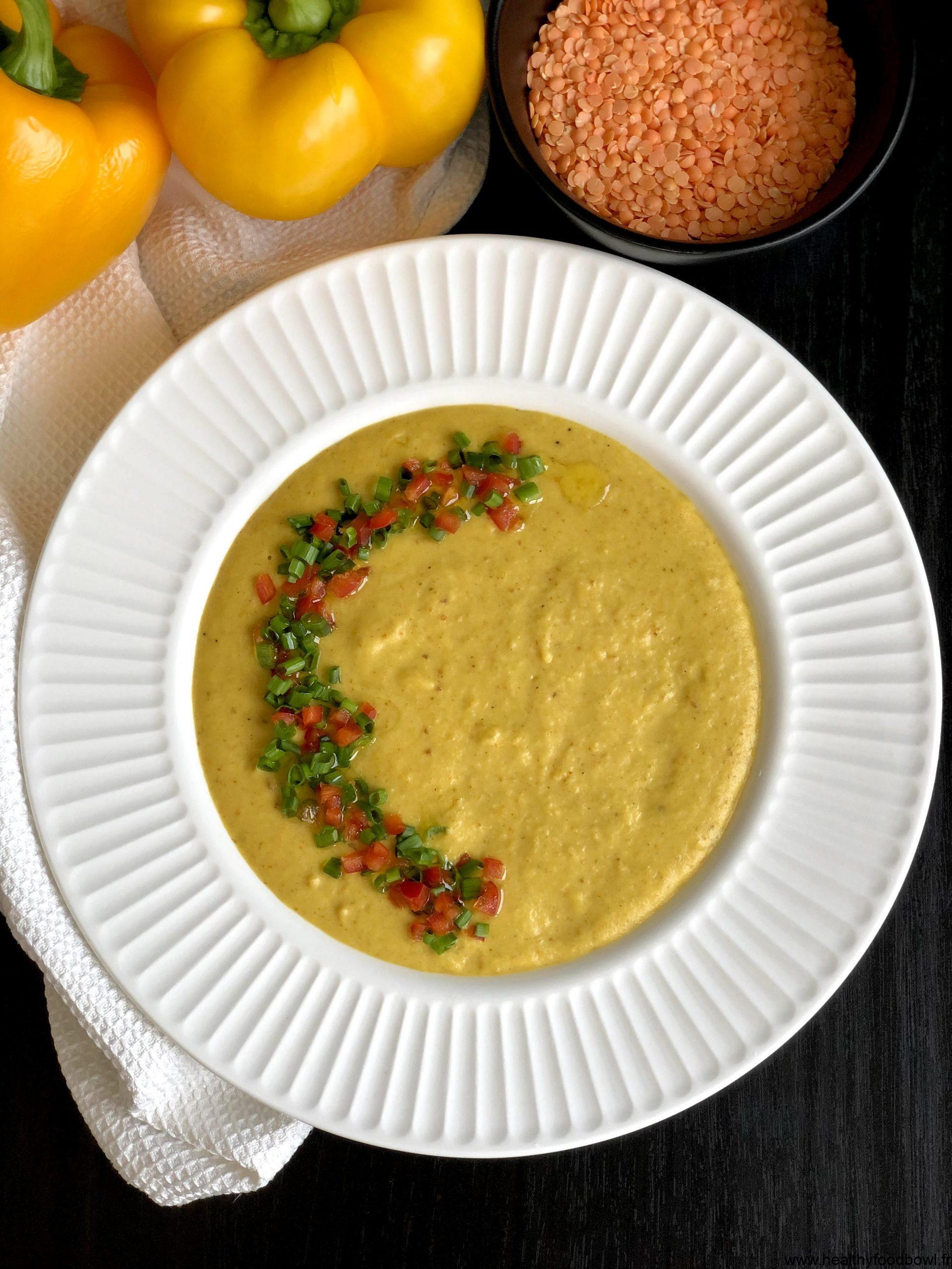 – 2 poivrons jaunes, 60 g de lentille corail, 330 ml de lait de coco, 5 cl d’eau, 2 gousses d’ail, 15 ml d’huile d’olive, 5 g de curcuma frais, cumin, poivre et sel.